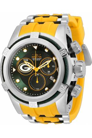 Band For Invicta NFL 30234, Band Material Silicone, Stainless Steel, Band Color Green, Yellow, Steel, Band Width 35 mm, Band Length 210 mm, Buckle Type Buckle, Clasp Type Regular